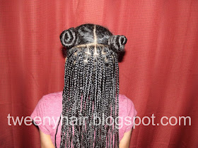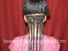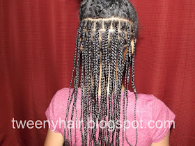Syd left this morning to spend a week at camp (insert nervous/sad mommy face here). Since I won't be there to help her with her hair, I had to figure out what would be easiest for her. I decided to give her some box braids. They should hold up even though she's going to be sweating and swimming every day.