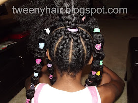 Unless you look closely, you'd never be able to tell there are over 30 braids hiding in the middle of these banded pigtails. The look is a little juvenile for an 11 year old, but it did hide the half-done hair and Syd really isn't too concerned with what others might think.